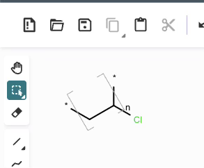 A final comment is something I noticed when preparing this post. It is common in polymer chemistry to draw external external attachments as a plain bond. Here is the wikipedia depiction of polyvinyl chloride:
