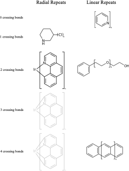 Something that may not be obvious when you first encounter repeat groups is that although in polymer chemistry they are typically linear, for structure queries we can also have what I will call radial repeats. With a radial repeat the repeat unit “rotates” around a single external atom – they are implicitly bounded by the number of bonds that atom can have. They can have an odd or even number of crossing bonds and it depends on the grouping of the crossing bonds as to what type of repeat you have. The table below shows this, I have put some hypothetical examples in light grey to show the pattern repeats.